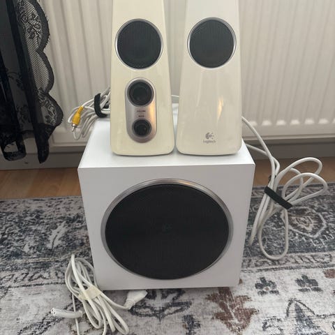 Myydään täysin toimiva Logitech Z523 2.1 stereokaiutinjärjestelmä. Mukana kaksi kaiutinta, subwoofer ja kaikki johdot. AUX-liitännällä, eli voi käyttää mm. tietokoneen tai joidenkin televisioiden ym. kanssa. Äänenvoimakkuuden ja basson säätö etukaiuttimessa. Kauittimien etumuovit hieman kellastuneet, mutta siinä ainoa moite. :)