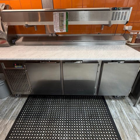 Teräksinen keittiötyöpöytä, jossa useita vetolaatikoita ja kylmälokero. Työpöytä on varustettu pyörillä liikkuvuuden helpottamiseksi. Soveltuu ammattikeittiöihin ja tiloihin, joissa tarvitaan kestävää ja helposti puhdistettavaa työskentelypintaa.