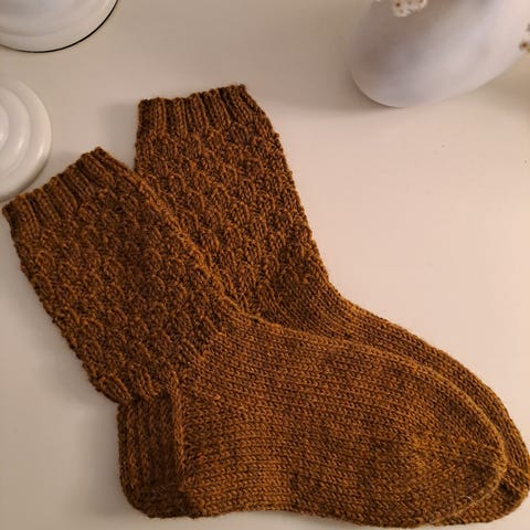Lyhytvartiset villasukat 7-veljestä langasta. Väri ruoste. Koko 38-39 hinta 12e. Haku tai postitus. Mahdolliset postikulut lisätään hintaan.