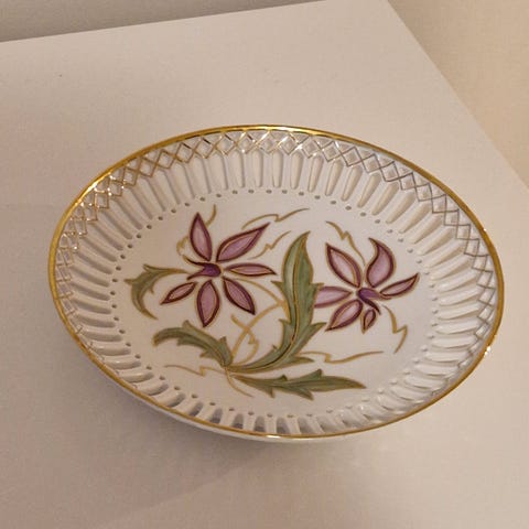 Soppakulho, jonka korkeus on 13 cm ilman kantta, suuaukon laajuus 17 cm, leveys korvasta korvaan 29 cm. Kunto erittäin hyvä, lähes käyttämätön astia.