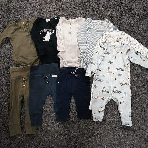 Myydään vaatepaketti koossa 62-68. Merkkeinä Newbie, Name it, Moomin ja HM. Pesty hajusteettomalla pesuaineella, kaikki ehjiä ja tahrattomia. Muuminody on käyttämätön.