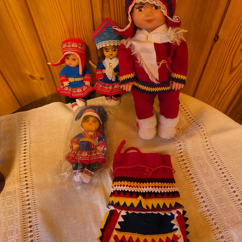 Myydään kuvanmukaiset lapinnuket. Nukkien takana lukee Rovaniemi Finland.