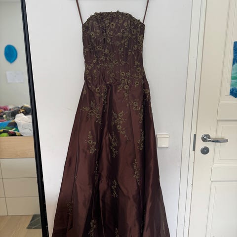 Upea fuksianpunainen jenkeistä tilattu iltapuku vanhojen tansseihin. Koko vastaa 32 kokoa, sopii sirolle ja pienikokoiselle. Pukua pienennetty yläosasta ompelijalla.