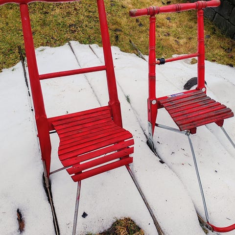 Kolme potkukelkkailijaa kaksi punaista lapsille ja puinen uusi viime talvena hankittu timanttisessa kunnossa oleva.