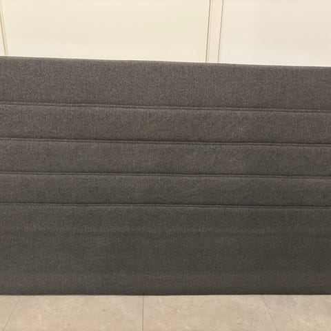 Mustasta akustiikkapaneelista sängynpääty, mustalla mustalla metallilistalla. Yhden paneelin leveys 30cm.