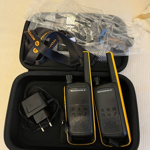 Motorola TLKR T80 Extreme -radiopuhelinsetti sisältäen kaksi keltaista Motorola-radiopuhelinta latausasemalla, 2 akkua, headphone setit molempiin ja tarvikesalkku. Mukana tulee myös säilytyskotelo ja johdot. Radiopuhelimet ovat kompakteja ja helppokäyttöisiä, sopien monenlaisiin tilanteisiin.