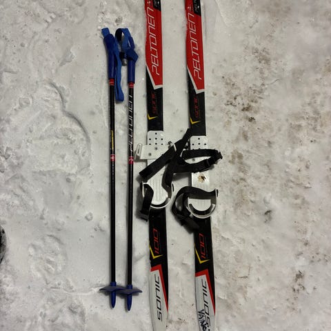 Lasten suksipaketti. Sukset 137cm (siteet SNS) ja sauvat 120cm.