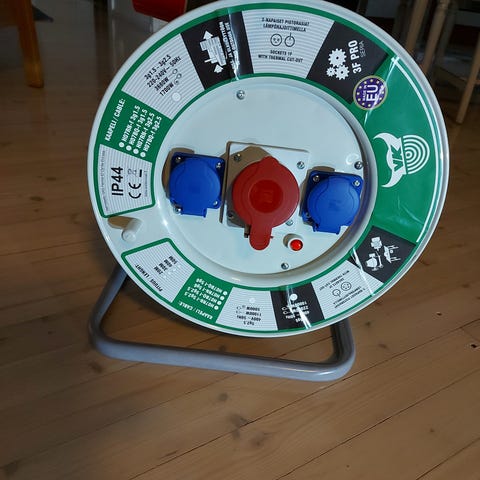 Toimiva kuvan mukainen jatkojohtokela. Käytönjälkiä ja 1 lohkema muovissa.