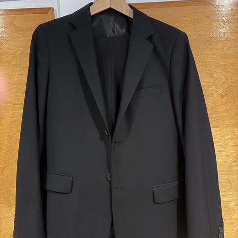 Poikien musta puku, kuvassa väri on haaleampi, mitä oikeasti on. Ollut käytössä muutaman kerran, puku pesty, mutta kaipaa silitystä.