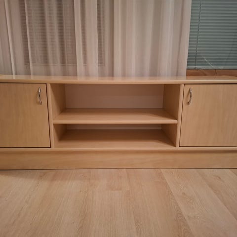 Kuvan mukaan hyvässä kunnossa tukeva valkoinen TV taso. Käytön jälkiä on jonkun verran. Mitat K45xL175xS43.