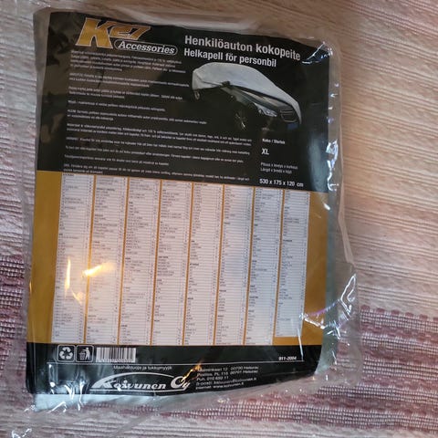 Auton suojapeite Biltema, kooltaan 485x178x124, kaupassa peitteen ovh 42,95. Tuotteen tiedot kuvassa 2. Muuten hyvä mutta väärä koko minun käyttöön. Sovitettu ja pakattu takaisin myyntipakkauksen.