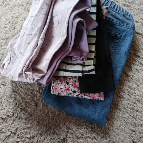 Tyttöjen vaatepaketti jossa 7 leggingsit koossa 98/104 (eri merkintöjä näiden kokojen väliltä). Osa käyttämättä, toisia käytetty enemmän, kaikki ehjiä