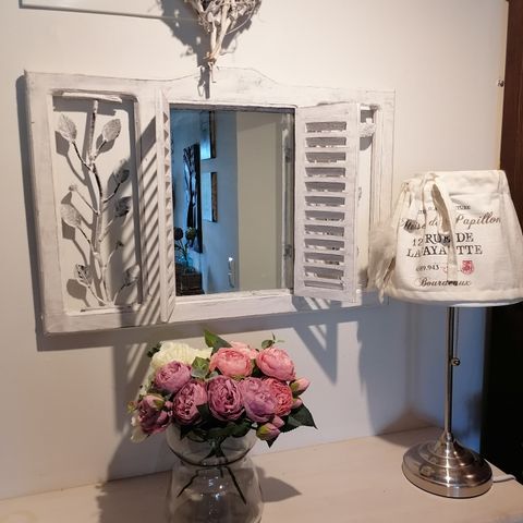 Peili, jossa kaunis luonnonvalkoinen rustiikkinen puukehys. Kokonaisleveys 52 cm ja korkeus 66 cm. Peilissä takana kiinnikkeet.