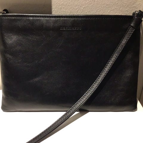 Musta nahkalaukku, jossa irroitettava olkahihna.