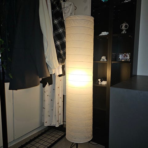 Harmaa jalallinen Ikean malliston valaisin. Korkeus 147 cm.