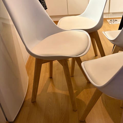 Jyskin valikoimasta ruokapöydän tuoleja 4 kappaleen satsi. 6 kk vanhat ja kunto kuin uusilla. Ollut airbnb-käytössä. Jyskissä uutena 40 euroa/kpl. Nyt irtoaa 20 eur/kpl. Koko setti siis 80 eurolla. Mittoja en ole ottanut, mutta tietoja löytyy täältä: https://jysk.fi/ruokailutila/ruokapoydan-tuolit/ruokapoydan-tuoli-kastrup-valkoinen-luonnonvarinen-tammi