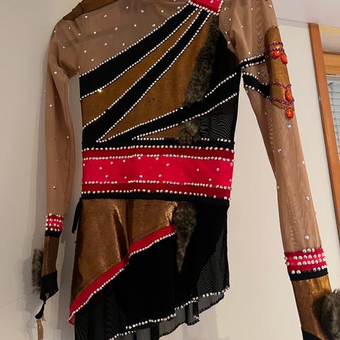 TT gymnastics, pitkähihainen moniväri voimistelu puku. Koko: 152 cm. 87 % polyamidi/nylon ja 13% elastaani. Olkapäästä hihaan: 48 cm. Puku on siisti ja hyväkuntoinen. Nouto Asola/Rekola tai tarvittaessa kirjemaksu 5,50€ lisätään