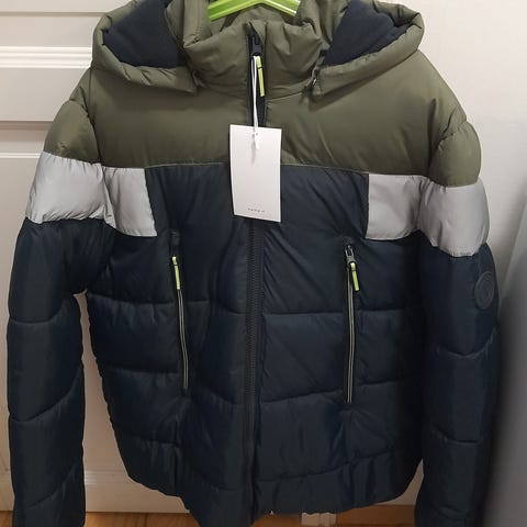 Uusi todella nätti pitkä toppatakki. Tyylikäs kuosi, pehmeät värit. Pitkä mukava malli. Irrotettava huppu, taskut, hihoissa trikoresorit.