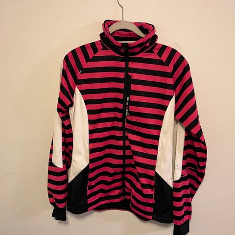 Halti naisten juoksutakki, koko 40. Takki on harmaan ja vaaleanpunaisen värinen. Edessä ja takana on vaaleanpunaiset toppaukset. Takissa on pitkä vetoketju ja huppu. Materiaalit ja rakenne sopivat juoksuun ja muihin liikuntaharrastuksiin.