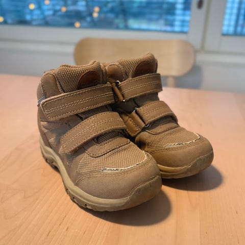 Sisäpuolelta kantapäät ehjät, sivulla pientä kulumaa näkyvissä. Takaa heijastimissa kulumaa.