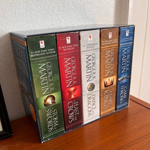 Myynnissä kaksiosainen kuvitettu ensimmäinen osa Tulen ja Jään laulusta. Mukaan halutessaan saa ensivuonna HBO:lla ilmestyvän Seitsemän Kuningaskunnan Ritari-novelli kokoelman, jossa on kolme ilmestynyttä Dunk & Egg-tarinaa