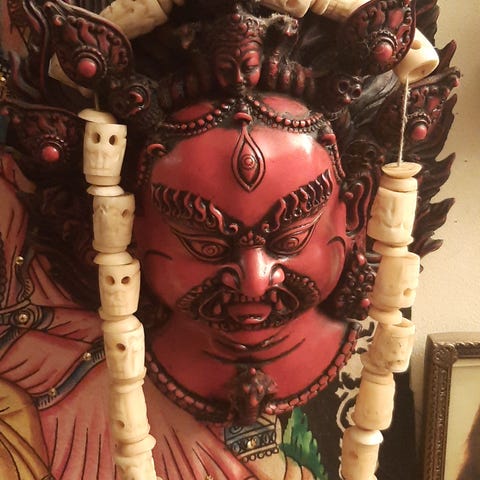 Balilaiset teatterinaamiot. Kyseessä ilmeisimmin Tepang Pajegan teatterin hahmot Sidakarya Selem ja Panglembar Keras. Naamiot hankittu antiikkiliikkeestä 25 vuotta sitten.