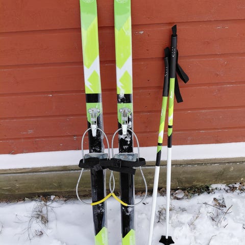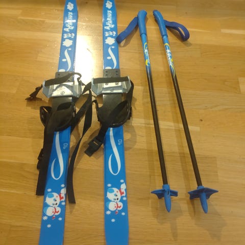 Lasten ensisukset. Kenkiin kiinnitettävät. Ehkä noin 80cm korkeat.