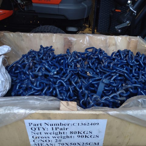 360/80R20 palarenkaan päällä olleet jääketjut, 7x7mm neliönastalla. Keskiketju kulunut sivuja enemmän. Jatkopaloja tarvittaessa mukaan. Ketjuja 4kpl. 175€/kpl