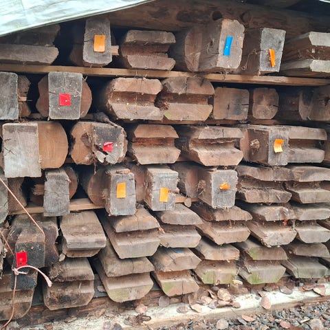 Purettuja hirsiä pyöreitä ja neliskanttisia sekä lankkuja.