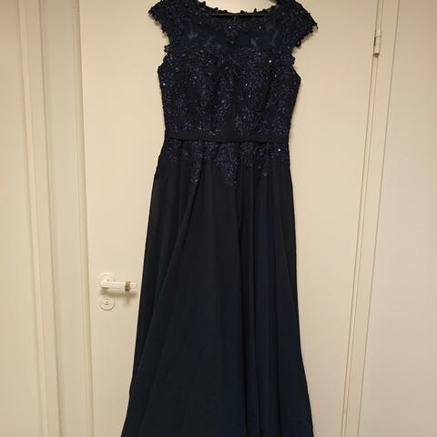 Upea tummansininen iltapuku 2000-luvun alusta. Vera Mont-merkkinen, koko 36. Muutaman kerran pidetty. Toinen olkain hieman rikki, näppärä saa varmasti helposti korjattua. Mukaan hartiahuivi. Hieno mekko esimerkiksi juhliin tai vanhojen tansseihin.