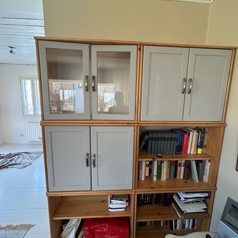 Hakusanat: sisustus, hylly, kirjahylly, asko, tumma, huonekalut, käytetty, lasiovet, koriste-esineet, Valmistaja, pohjoismainen minimalismi, käytetyt huonekalut, naarmut, puu, kulumajäljet, kirjat, säilytys