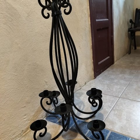 Hopean värinen näyttävä metallinen kynttelikkö viidelle kynttilälle.