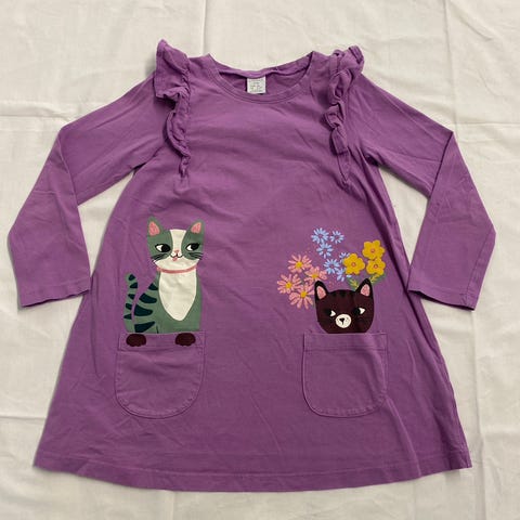 Kaksi Lindexin kissakuvioista tunikaa/mekkoa yhteishinnalla 6 euroa. Kirjava kokoa 116, violetti 122, hyvin sopivat käyttöön samaan aikaan. Käytetty hyvä kunto.