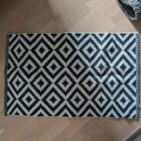 Sininen/beige puuvillamatto. Muutama pienenpieni tahra (kuvassa näkyy) ja vähän rispaantunut yhdestä reunasta. Taloudessa ei ole eläimiä. Nouto