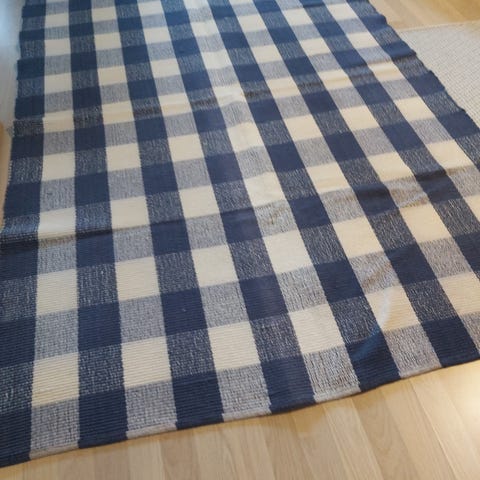 Sininen/beige puuvillamatto. Muutama pienenpieni tahra (kuvassa) ja vähän rispaantunut yhdestä reunasta. Taloudessa ei ole eläimiä. Nouto