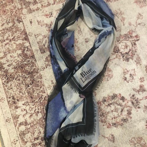 N. 185 cm pitkä huivi, vähän käytetty. Mustassa osassa kultaiset, metalliset yksityiskohdat. Kääntöpuolella vaalea väri hallitsee, ks. kuva 3. Voin toimittaa Turku-Lieto-akselilla. :)