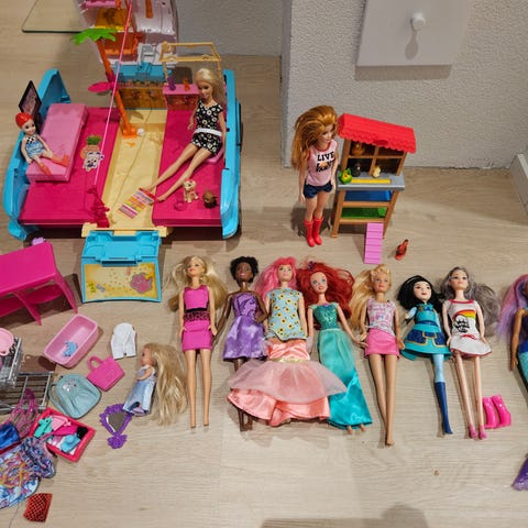 Myynnissä 12 Barbie nukkea ja 13 muuta nukkea sekä Tuhkimon hevoskärryt. Mukana on esim. 3 Disney nukkea: Tuhkimo, Ariel ja Mulan. Mukana myös paljon varusteita. Lelut ovat pääasiassa hyvässä kunnossa. Kaikki alkuperäiset varusteet eivät ole tallessa. Tuhkimon hevosen yksi jalka on löysällä (ei ole irti, eikä irtoa).