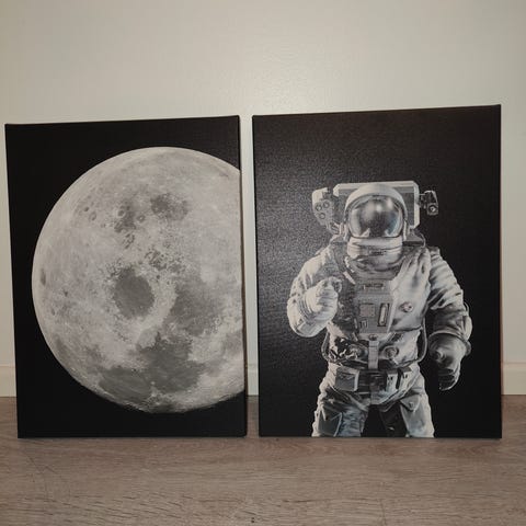 IKEA taulut, joissa on erilaisia kuvia kuten astronautti, kuu ja rantamaisema. Taulut soveltuvat sisustukseen ja seinäkoristeiksi.
