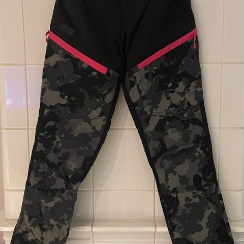 Housuissa on joustava vyötärö ja useita taskuja, mukaan lukien sivutasku, sekä vahvistetut osat polvien ja lahkeiden alueella. Materiaali on kestävää ja soveltuu ulkoiluun ja työskentelyyn.