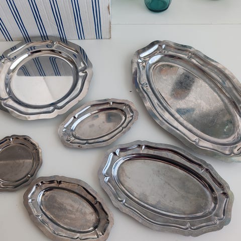 Kolme teräksenväristä tarjoluastiaa, kaksi pienempää ja yksi isompi, kertaalleen käytetyt. Koko näkyy kuvissa, eivät kestä konepesua, säilytyksessä tullut pienet ruostejäljet sivuun, yritän vielä putsata pois, katso kuva. Hinta kaikille kolmelle yhteensä.