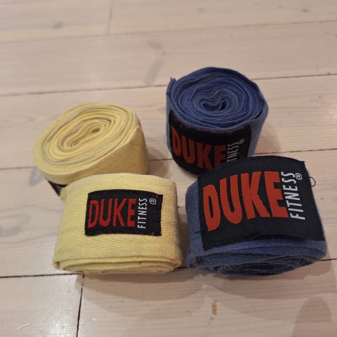 Kaksiparia eripituisia käsisiteitä nyrkkeilyyn myynnissä. Ei haise. Hinta on yhteensä
