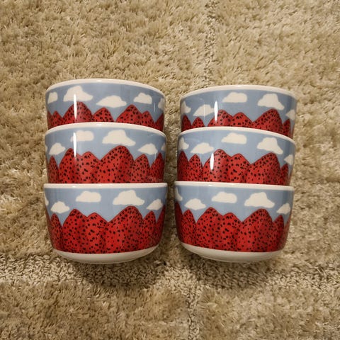 4x pientä ja hyväkuntoista Marimekon Mansikkavuoret sarjan kulhoa. Kulhojen yhteishinta on 40€ ja myydään settinä.