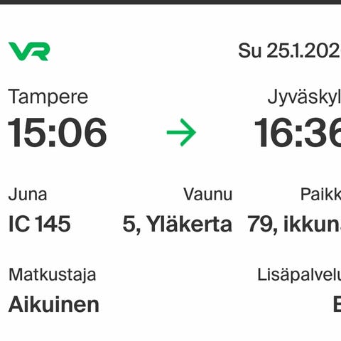 Junalippu Hämeenlinna - Tampere - Jyväskylä, su 11.1. 19:11 - 21:35, opiskelija