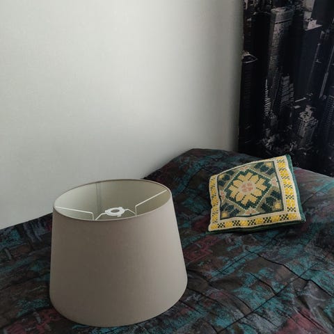 Luonnonvalkoinen / norsunluunvärinen lampunvarjostin. Korkeus 25,5 cm. Halkaisija ylhäällä 20 cm, halkaisija alhaalla 40 cm. Mieluiten nouto.