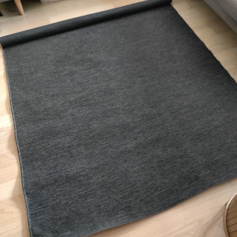Harmaa-valkoinen matto. Koko 160x120 cm. Ollut vain hetken lattialla ja todettu omaan sisutukseen sopimattomaksi.