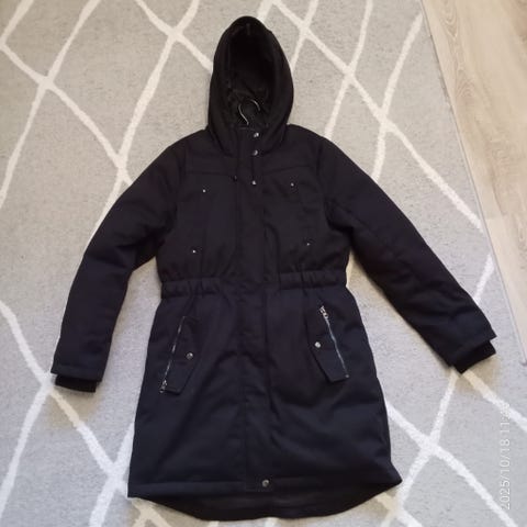 Vero Moda pitkä takki naisille, koko L. Takki on mustan värinen, muhkea ja lämmin. Täytteenä polyesteriä. Käytetty kerran, mutta todettu vääränkokoiseksi itselleni. Täysin uutta vastaava. Sivuissa alhaalla vetoketjut, vettä hylkivä materiaalia hihoissa resorit, hyvä muhkea huppu. Täydellinen takki kylmiin talvipäiviin. Malli Elanor (Vmelanor).