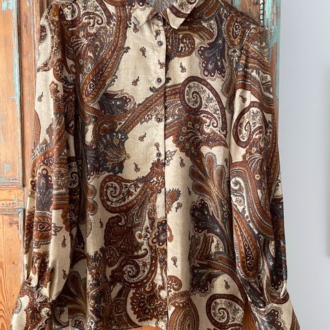 Mango pusero, koko L, sininen väri, valmistettu puuvillasta. Naisten vaate, jossa pitkät hihat ja solmittava nauha edessä. Väri ei ole niin kirkas, kuin kuvissa.