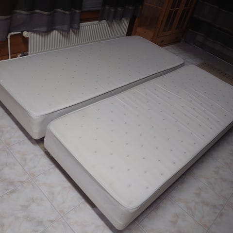 Alunperin vesisängyn runko johon teetetty runkopatjat 2x 90cm leveät. Sijauspatjan saa jos haluaa, siinä pestävä päällinen.