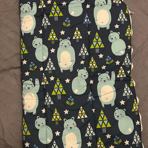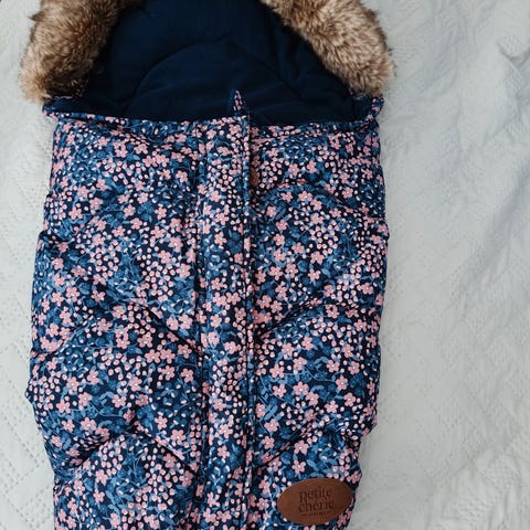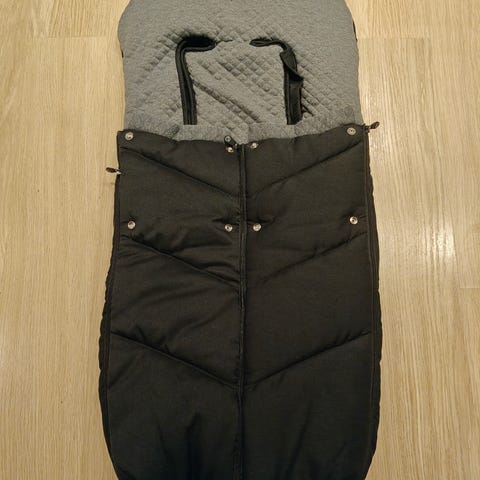 Hyväkuntoinen lämpöpussi kaukaloon. Pehmeä sisus ja vettäkylkivä kangas. Edessä napitus, takana irroitettava tarra turvavöiden laittoon. Jalka osion saa auki. Hupussa kiristysnauha.