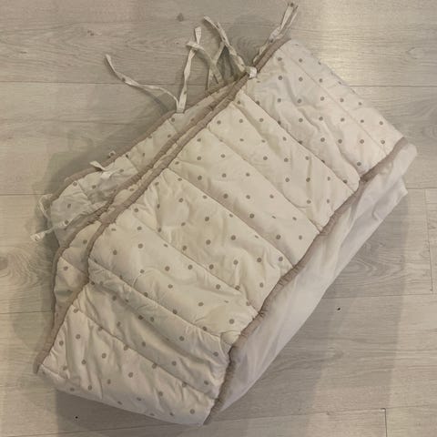 Vaaleanharmaa puuvillainen vauvan sängyn reunapehmuste, kiinnitysnauhat kaikilla sivuilla. Siisti käytetty kunto. Pesty juuri hajusteettomalla pesuaineella. Sopii normaalikokoiseen pinnasänkyyn, en mitannut nyt erikseen.